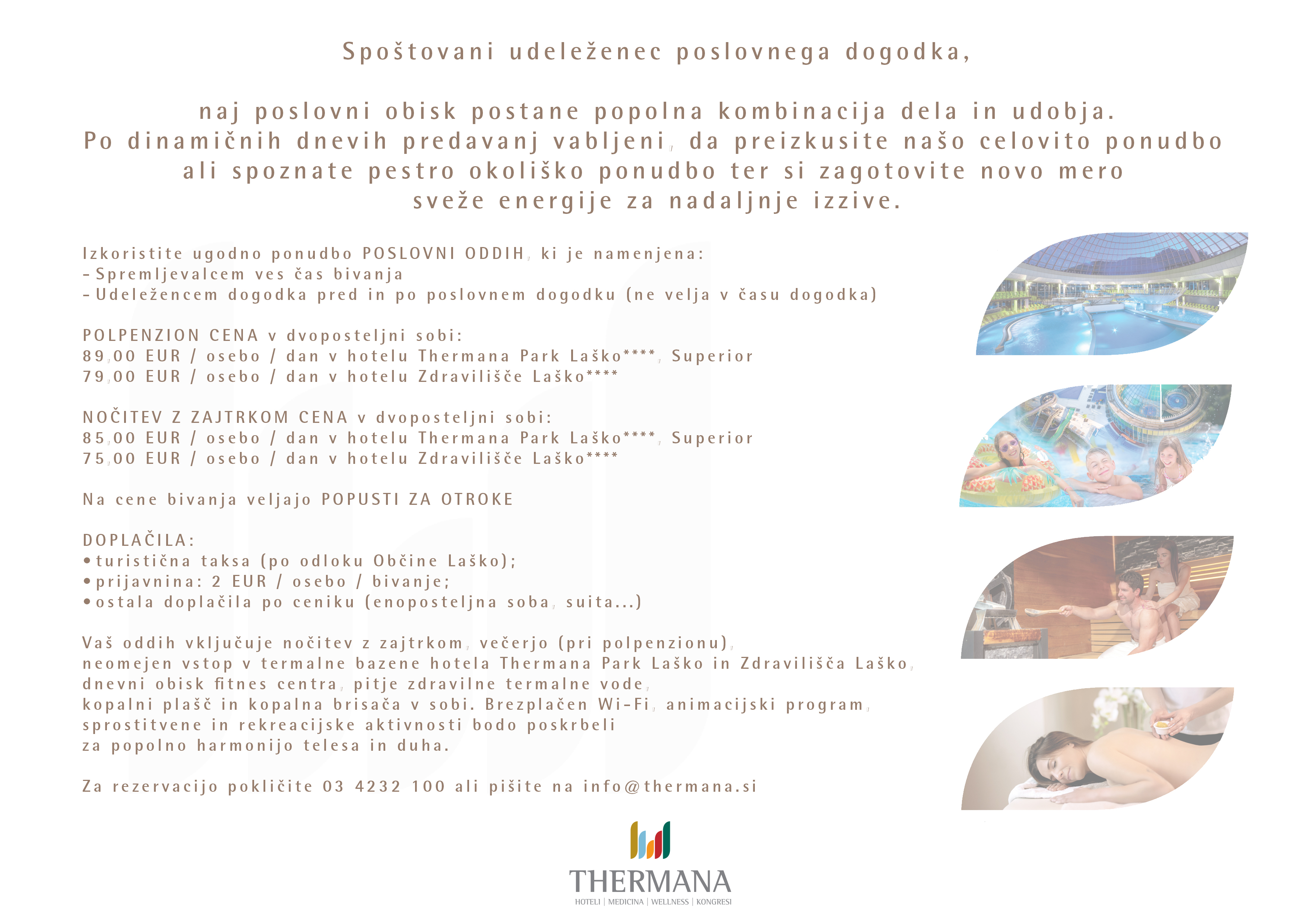 2) Ugodna ponudba za spremljevalce (ves čas bivanja) in udeležence v primeru podaljšanja bivanja (ne velja v času kongresa): Rezervacije na info@thermana.si ali 03 42 32 100.